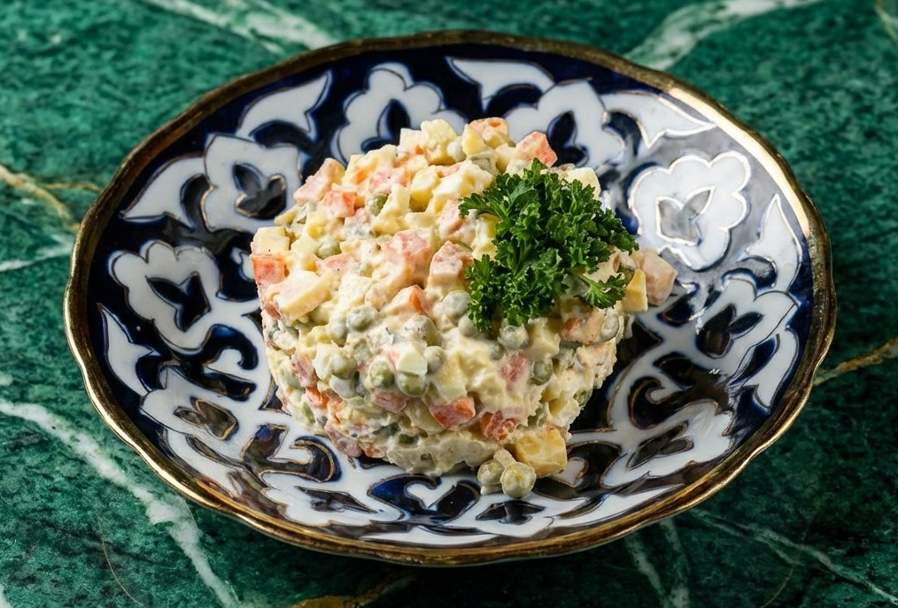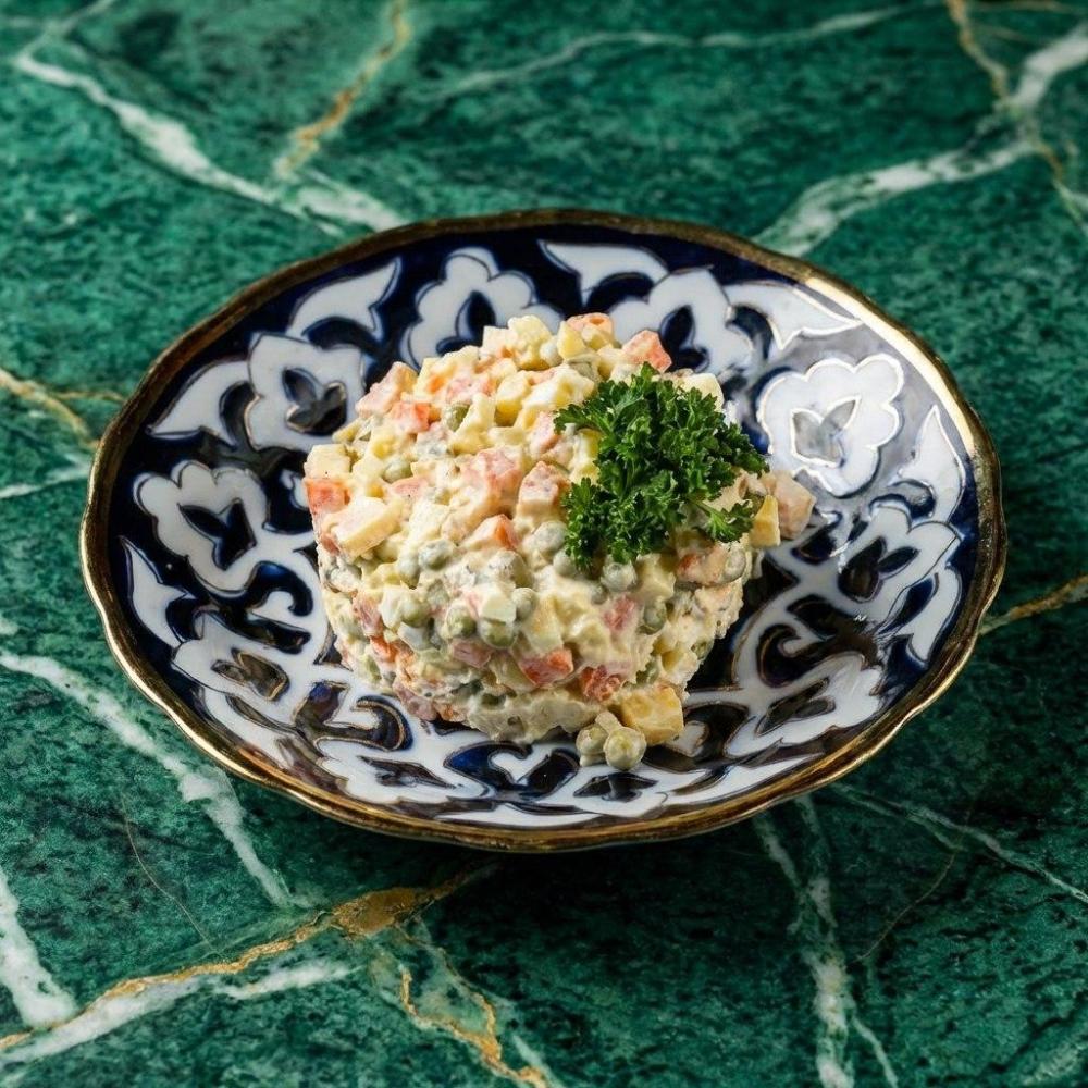 Салат «Столичный» — классика ресторанных меню советского периода, картофель, куриное яйцо, куриное филе, морковь, горошек, маринованный огурец под соусом майонез.