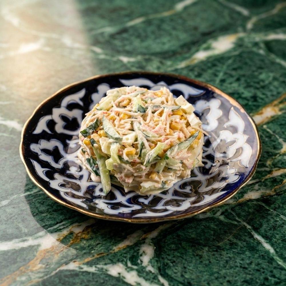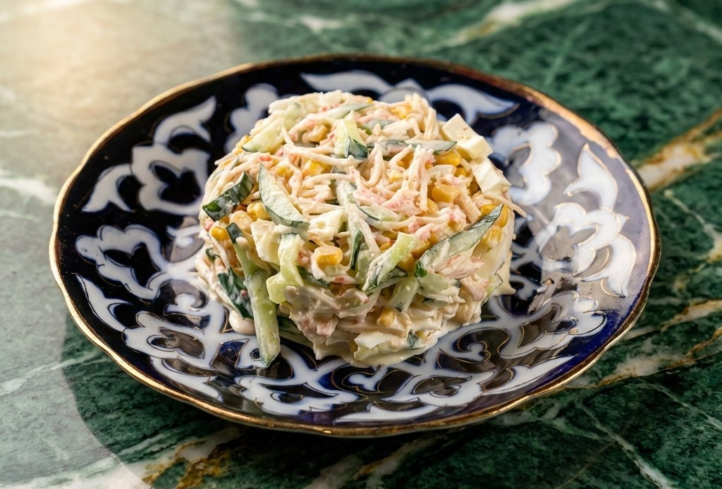 Салат из крабовых палочек классического рецепта с варёными куриными яйцами, консервированной кукурузы, свежим огурцом и майонезом.