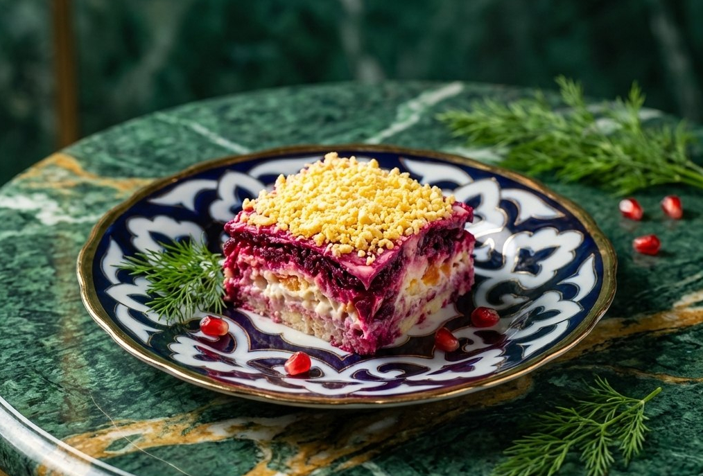 Сельдь под шубой — слоёный закусочный салат из филе солёной сельди с отварными корнеплодами и яйцом под майонезом