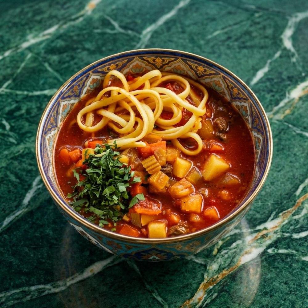 Шурпа - это густой насыщенный суп на говяжьем бульоне, с крупной нарезкой овощей и волокон отварной говядины.