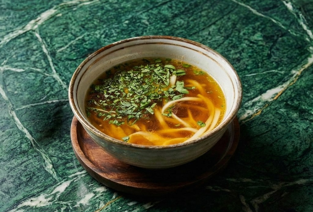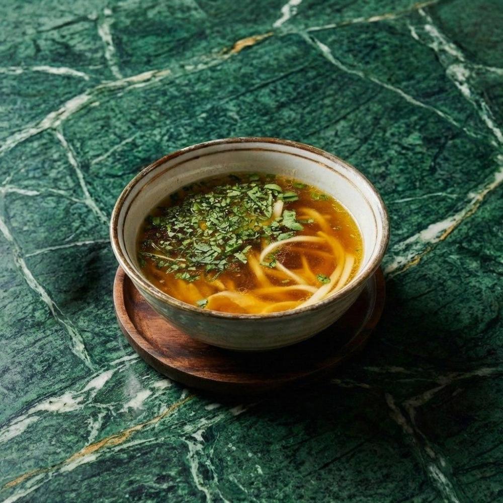 Золотистый наваристый куриный бульон с добавлением лапши, куриного яйца, волокна куриного филе и зелени